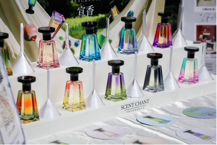 本次展會的亮點之一 : 「香頌國際」首度將品牌宣香 SCENT CHANT 引進台灣市場。該品牌以獨特的「調酒主題」香氣為核心,搭配造型別緻的倒立酒杯瓶身設計,成功在現場抓住大批香氛愛好者的目光。(圖片來源:SCENT TAIPEI)